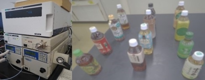 お茶に含まれているカフェイン、エピガロカテキンガレートを試薬とし、分析機器「高速液体クロマトグラフ」での測定結果をもとに検量線を作成しました。