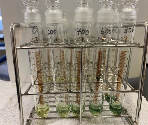 アンスロン試薬は、黄色ですが、加熱により写真のように青緑色へと呈色が確認できます。