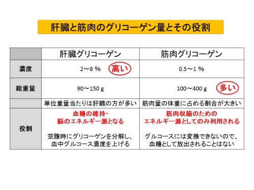 肝臓と骨格筋のグリコーゲン量を比較すると、次のようになります。