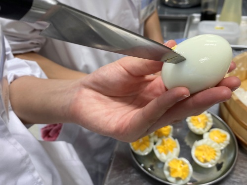 また、ペティナイフを使う実習では、花型のゆで卵を作りました。