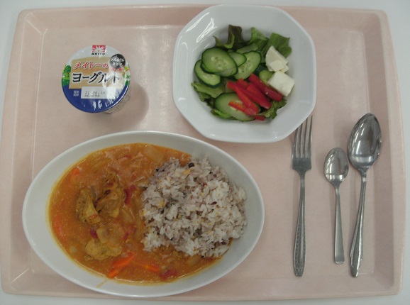 献立は「チキンカレー、サラダ、ヨーグルト」です。