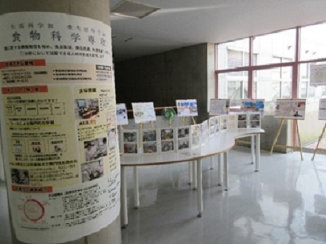 「展示スペース」には各専攻の紹介ポスター、食生活科学科の先生方の研究室紹介、給食実習・調理実習に関するPOP、実験・実習の使用機材等が広々展示してあります。