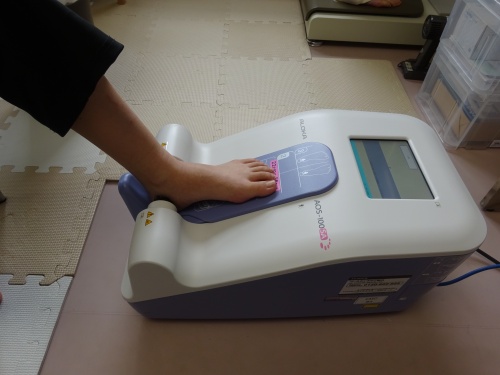 踵骨に超音波を当てて、その通過する様子から骨の強さを調べます。