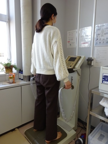この授業では、まず自身の身体組成と骨密度、ヘモグロビン値を測定します。