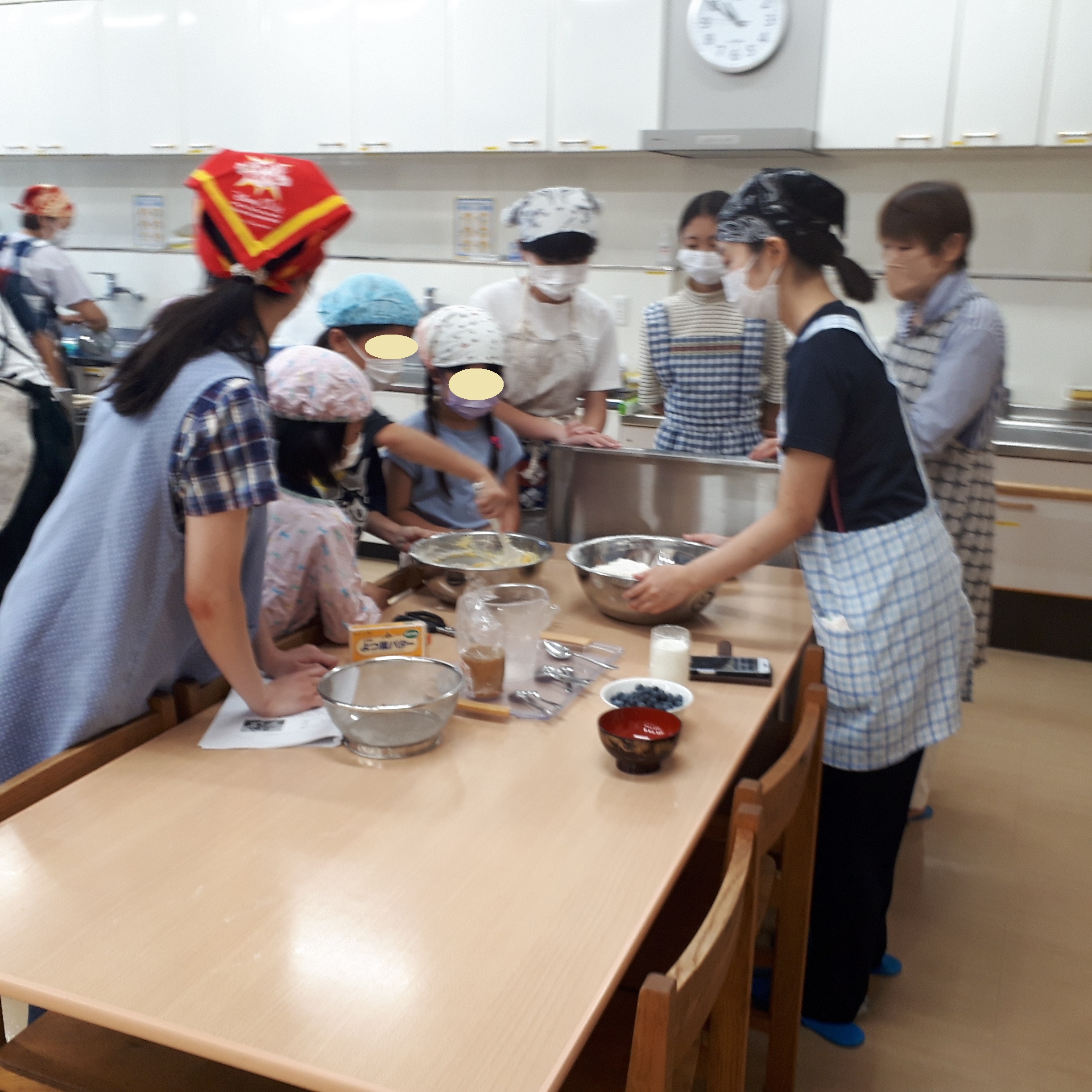昨年度までは、さつまいもの栽培から収穫までを年間を通しておこない、サツマイモのレシピ集を自治会の皆様方に配布させていただいておりました。本年度は地域のブルーベリー農園にて、地元自治会の方々、子どもたちとともにブルーベリー摘みをした後、ブルーベリーを使ったお菓子づくりをしました。