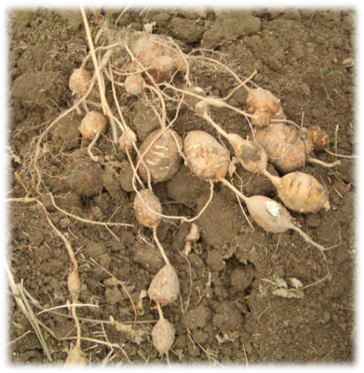 春にじゃがいもと同じように種いもを植えると、芽を出し、支柱に張ったネットにアサガオやヘチマのように、つるを伸ばしながら葉がつけていきます。夏には紫色のきれいな花を咲かせ、秋には地上部の葉が枯れ、やがて地下部には数珠状に塊茎がたくさんできます。