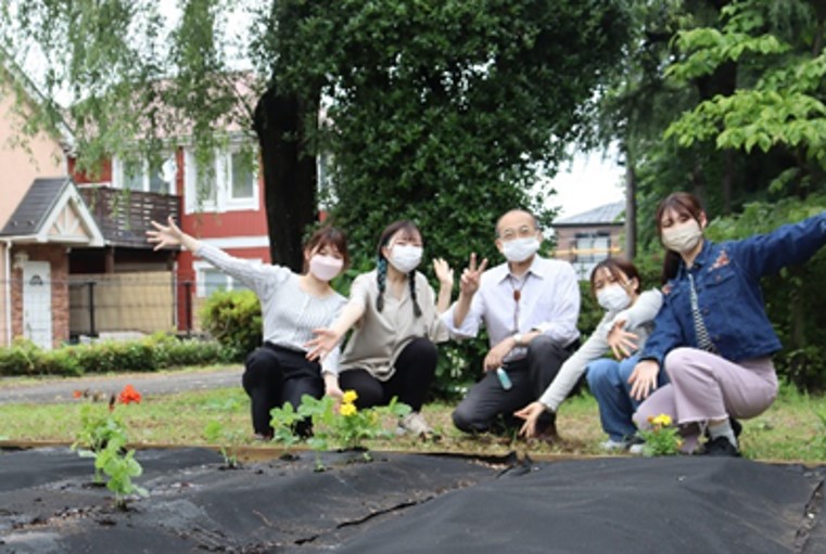 管理栄養士専攻2,3年の学生が、種まき、苗の受けつけを行い、みずから水やりローテーションを組み、草取りを行い、菜園の管理、育成をしています。