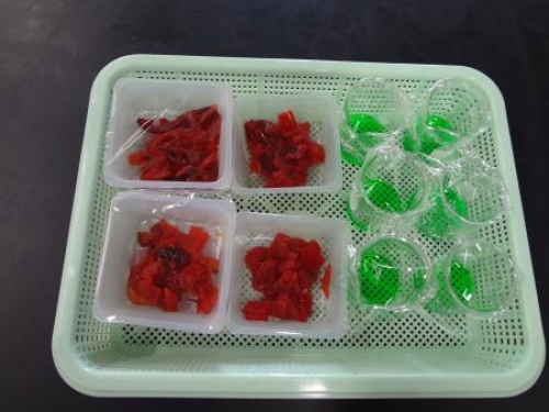 「食品衛生学実験」では、福神漬けの着色料も一緒に調べます。