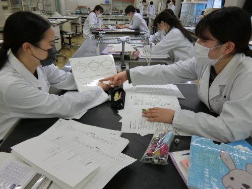 最後に、同じ1日のナトリウム・カリウム摂取量について、尿中排泄量から推定した値と24時間思い出し法により求めた値とを比べて、考察をしました。「食事調査では、食品重量の推定がきちんとできていなかったから誤差が出ているのではないか」「尿中には調査日より前の食事の影響も出ているのではないか」など様々な観点からの意見が出ました!