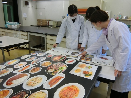 二人一組となり、お互いに実習前日の24時間に飲食したものを時間の経過に沿って聞き取り、食品の種類と重量を推定しました。食品重量の推定には、食器の大きさのスケールや料理カード、実物大の食品写真等を参考にしました。