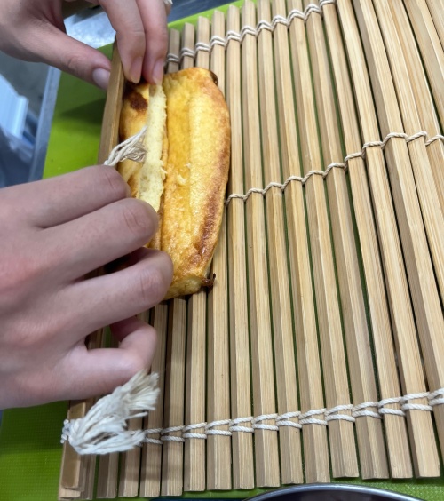 伊達巻は、細巻きで使用したすだれよりも角が鋭利な「鬼すだれ」を使用して巻いていきます。