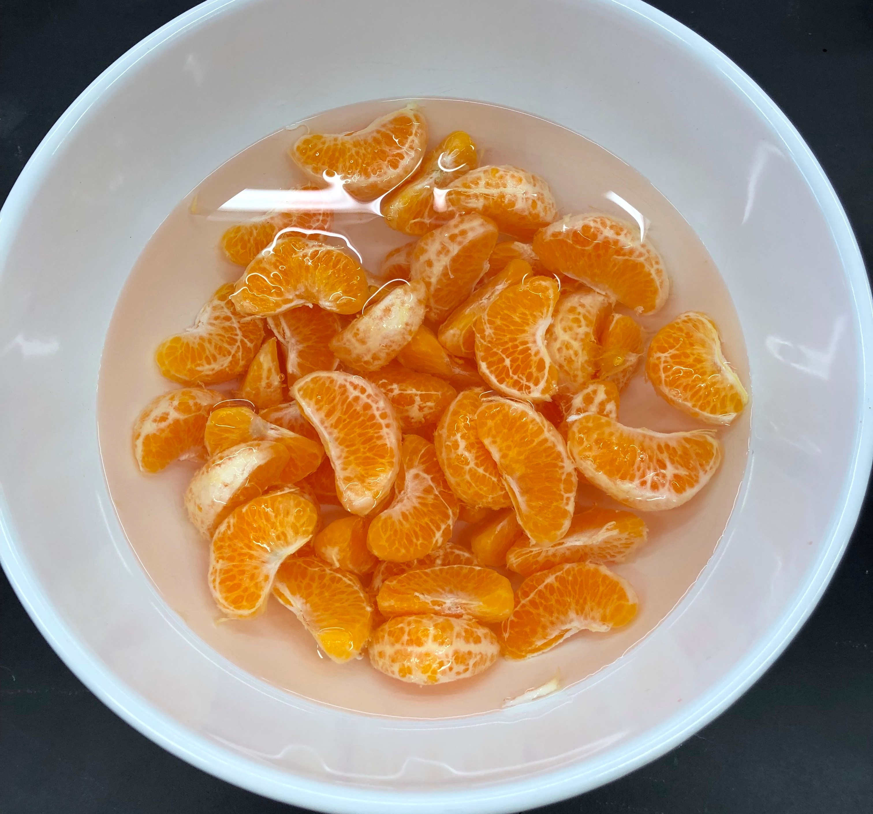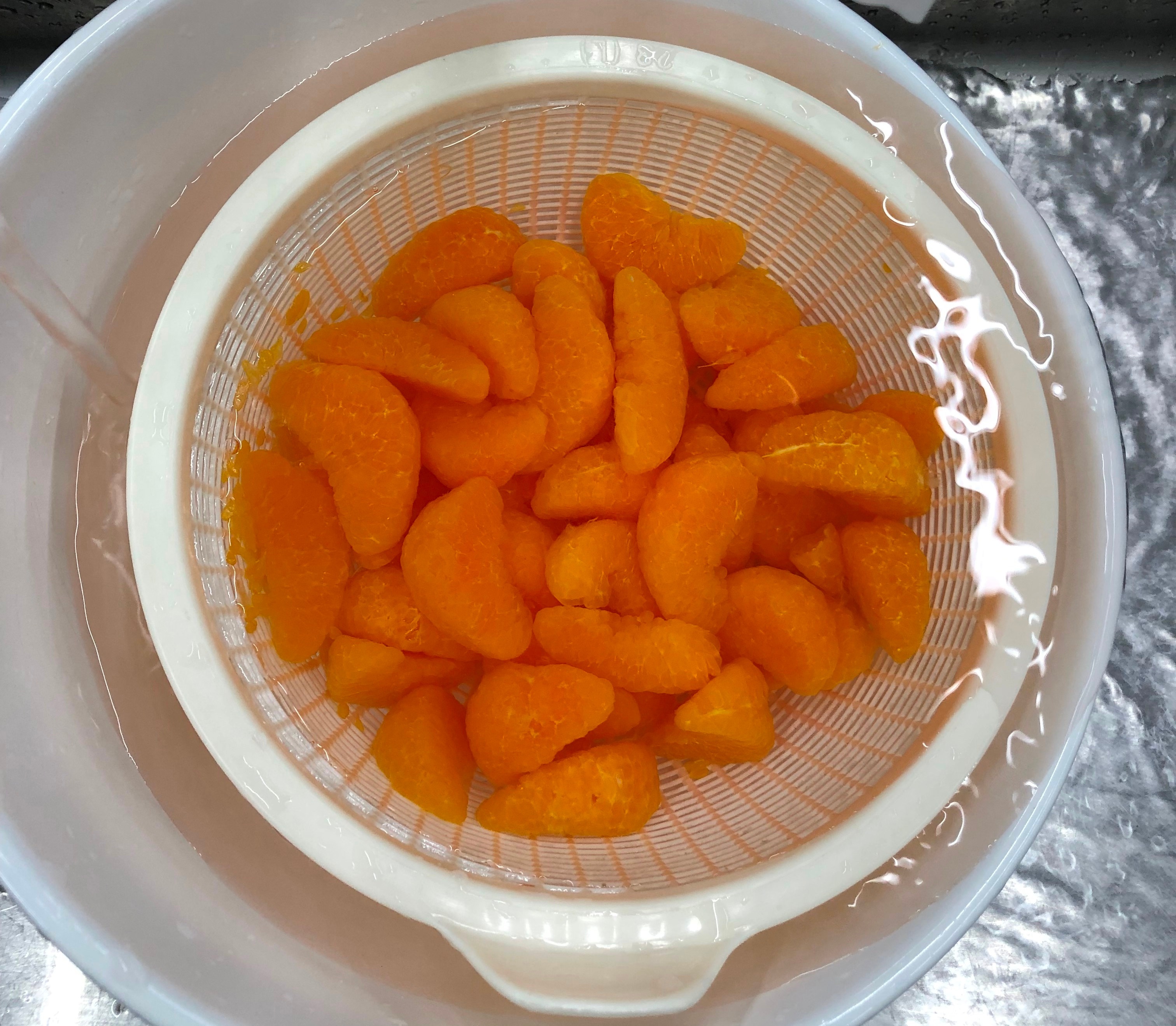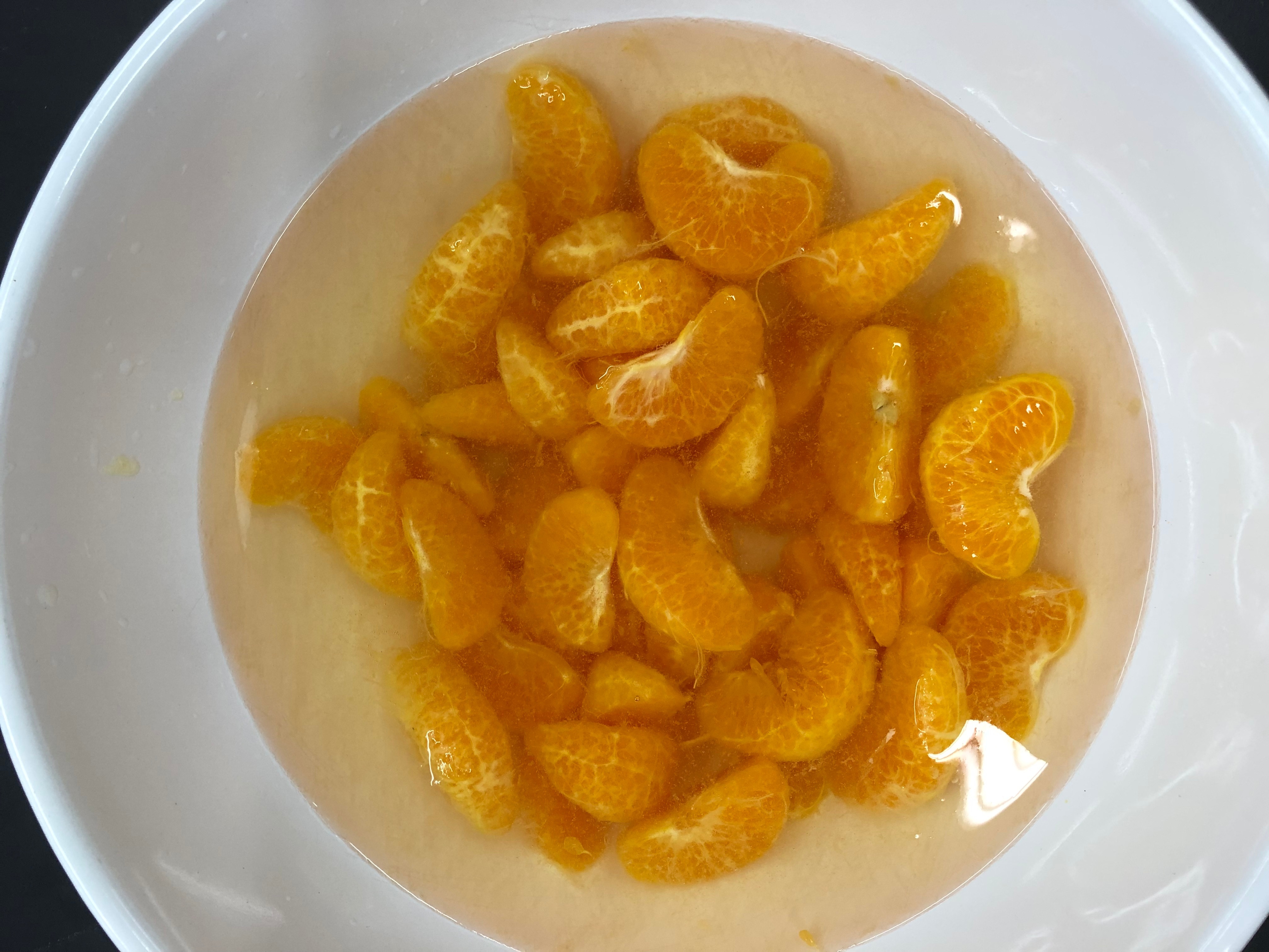 皮を剥いて一房一房分け、弱い酸処理→弱いアルカリ処理の順でみかんの薄皮(じょうのう膜)を取り除きます。