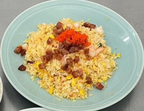 中国料理の食材の腸詰は市販のソーセージ等とは異なり、砂糖が入っているため甘く、特徴のある味がします。そこにエビととびっこを加えることで、一般的な炒飯とは違う、少し豪華な炒飯を味わうことができます。