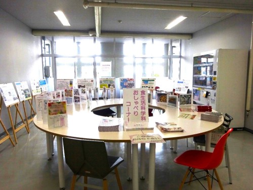 食生活科学科の展示コーナーには、各専攻の紹介ポスター、研究室紹介パネル、実験・実習で使用する資料や機器等が展示してあります。