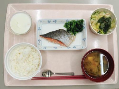 ごはん、豆腐とわかめのお味噌汁、鮭の塩焼き、ほうれん草のお浸し、ポン酢海苔サラダ、牛乳寒天でした。