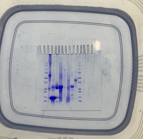 こちらの写真は、食品に含まれるタンパク質を分析するために作成した染色済みのゲル板です。
