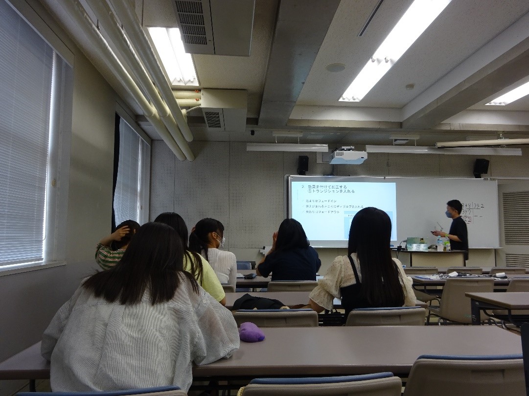 撮影後、編集ソフトを使用した動画の編集の仕方、テロップの付け方、効果的なBGMの付け方等を学びました。