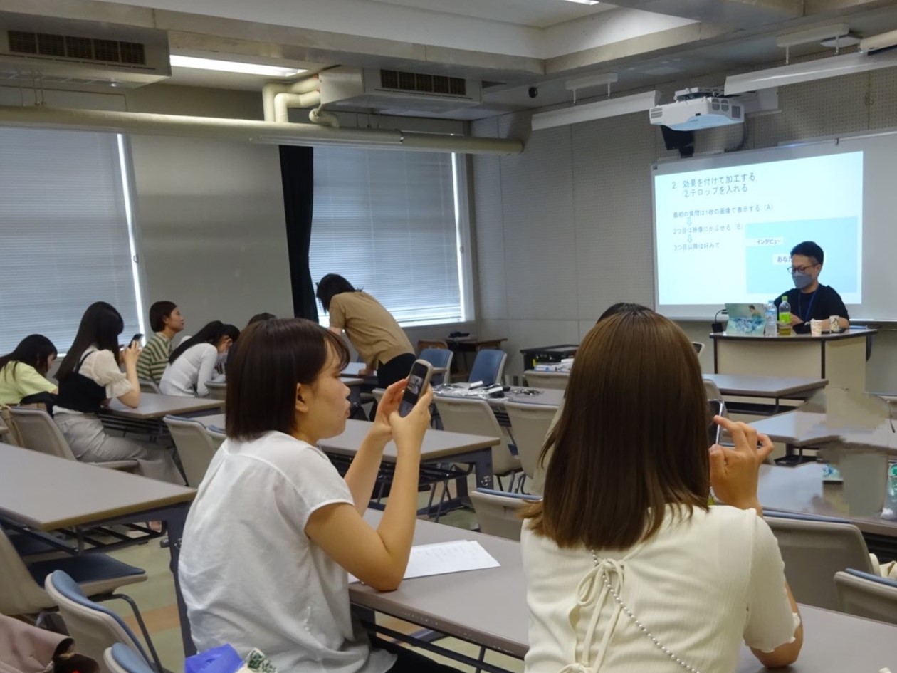 講師は、映画監督の山﨑達璽先生にお願いいたしました。実際の動画投稿サイトでは、携帯電話で動画を撮って投稿する場合が多いため、携帯電話で完結できる動画撮影と編集方法を学びました。