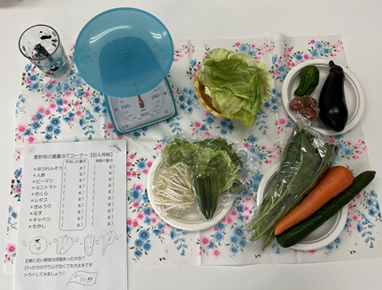 「野菜の重量あてコーナー」では、来場された高校生の皆様がいろいろな野菜を手にとりながら重さを考え、野菜を秤にのせていました。秤量した野菜はキャベツ、ほうれん草、ミニトマト、なす、きゅうり、人参、もやし、おくら等様々なものを展示しました。