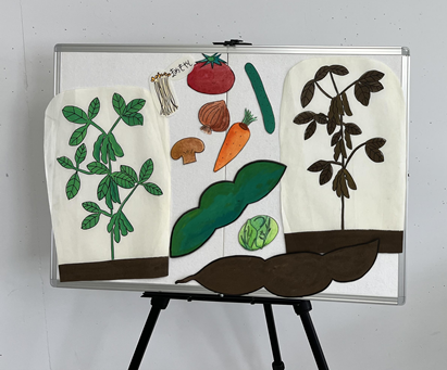 また、学生が食育授業で作成した、枝豆など野菜のフェルト生地の貴重な教材を展示いたしました。