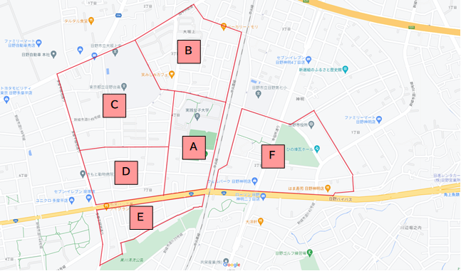キャンパス周辺をA~Eの6ブロックに分け、各班で踏査、観察し担当エリア内の「食物入手可能性・食情報の可能性」を把握して全体地図に施設別にプロットし、食環境情報を共有しました。