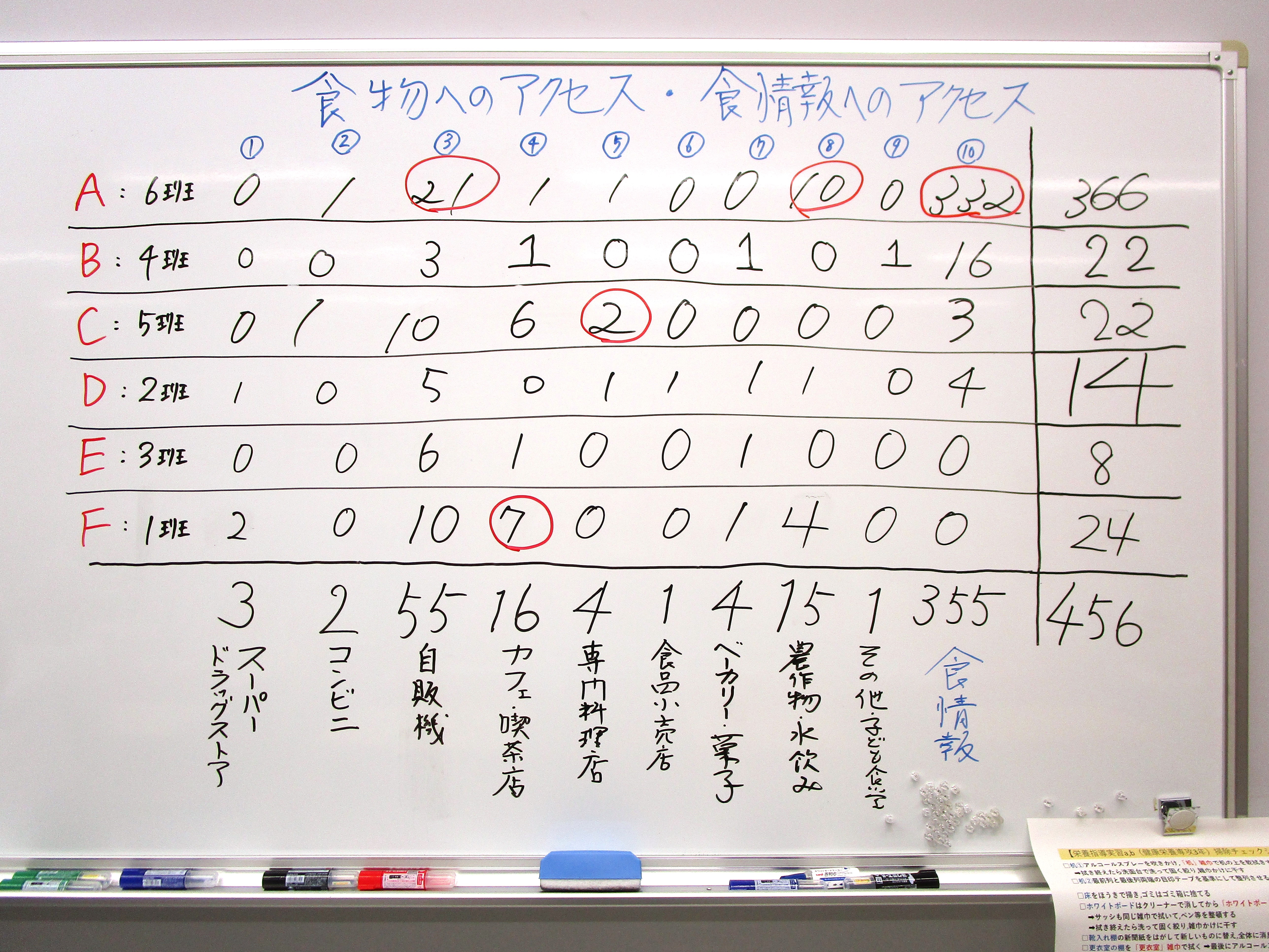 6つの班員は、食環境調査終了後三々五々教室に戻り、食環境マップに施設別にプロットし、キャンパス周辺の食環境について情報共有のために、プレゼンテーションしました。