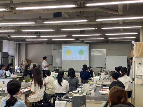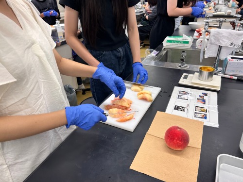 体験授業では、「買いたくなる食商品とは?」、「なぜヒトは肥満になるのか?」というテーマの講義や「桃の缶詰作り」、「糖質の種類の違いを調べる実験」の実験実習を行っていました。