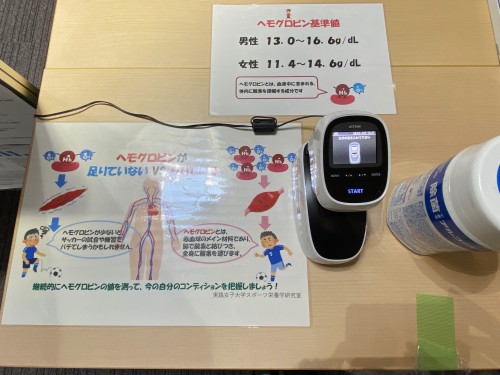 今回の展示コーナーでは、大量調理の実習で使う大きな調理道具や、種類の違う茶葉の香りを楽しむコーナーなど様々な展示物があり、多くの方が訪れていました。中には、血液中のヘモグロビンを測定できる機器もあり、実際にご自身の血液の健康状態をチェックし、安心された様子の方もいらっしゃいました。