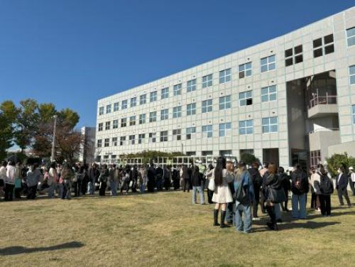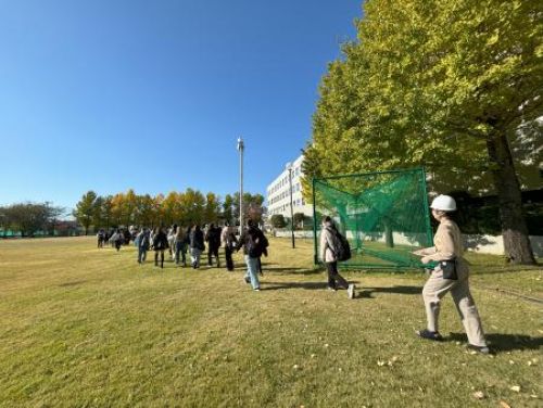 今回の避難訓練では大型地震発生を想定し、学生と教職員の避難経路、在校している学生全員の避難誘導方法、避難動作について確認を行ったのち、その場で安全確保及び放送訓練、グラウンドまで避難しました。