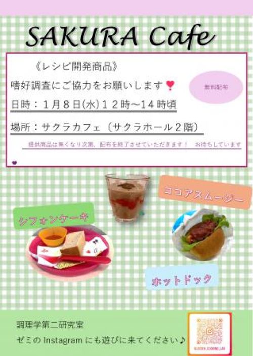 1月8日(水)に実施された調理学第二研究室のゼミ生による、さくらカフェの活動についてご紹介します。