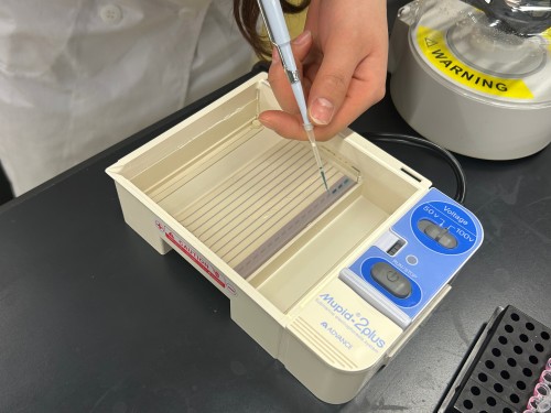 ゲルに注入する量は10 µLと非常に少ないため、学生たちは慎重に作業を進めていました。