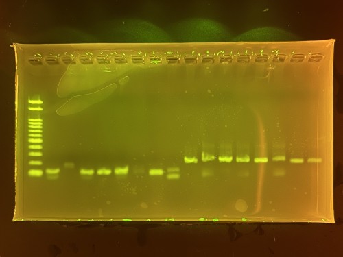 電気泳動が終了したら、青色LEDトランスイルミネーターという装置で480 nmの光を当て、ゲルを観察していきます。