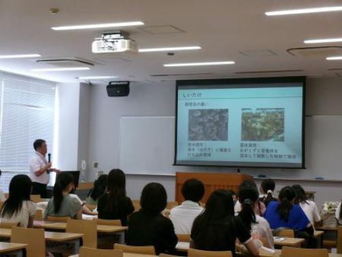 実践女子大学では通常100分授業ですが、今回の体験授業では40分として、食科学科は「食資源を活用した地域活性化」、管理栄養学科では「人間のからだの成り立ち入門」について、授業を実施しました。