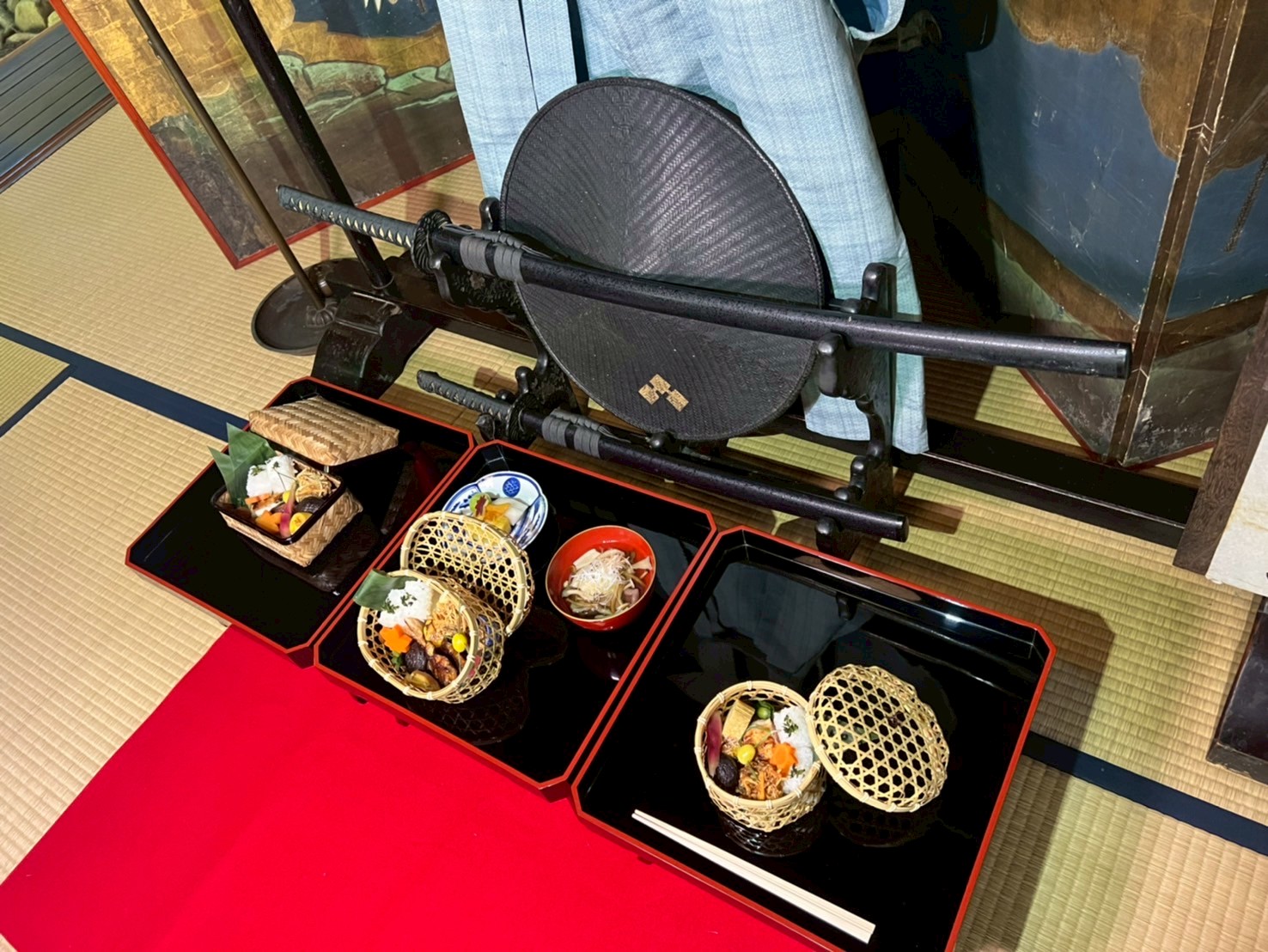 『下諏訪本陣EDO BENTO』は、白飯(物相飯)に主菜4品、御菜7品の料理を組み合わせました。岩波家本陣の玉座の間での提供を想定し、さらに下諏訪地域の食材を使用して「汁物」と抹茶に「御菓子」を添え、ランチコースをイメージした御弁当に仕上げました。
