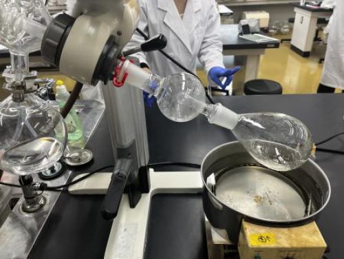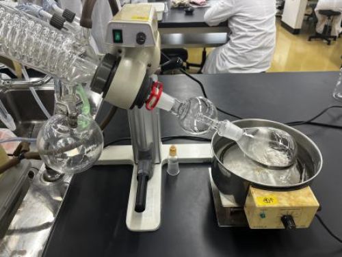 まず、第4回目に準備しておいた液体試料の抽出液を濾過した後、エバポレーターという機械を使って濃縮します。こちらは「りんご酢」を選んだ班の抽出液で、酢酸エチルという溶媒に溶け込んだ物質が得られます。