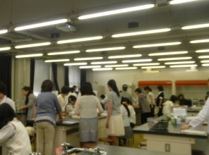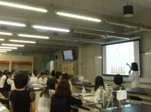 当日は、澤山先生による「人間はなぜ、何を、どのようにして食べるのか」、山崎先生による「卵の泡立て方の科学」の2つの講義と白尾先生による「食品の色の変化について」の実験が行われました。
