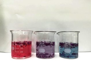 左から酸性(食酢)、中性(蒸留水)、弱塩基性(重曹)
