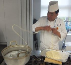 指の間から紡がれていく麺生地は、まるで生き物のようです!