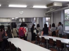 授業で実習室を使用している学生スタッフが調理室内の構造や調理器具の説明をすると、受験生の方はとても興味深く聞いていました。