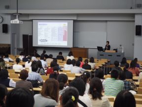 このような在学生と交流できる企画の他、食生活科学科では学科ガイダンスと、模擬授業として「エネルギー消費量を測ってみよう」、「食品の特性を利用した商品開発について」の2つの授業が行われました。