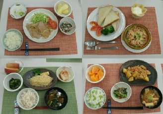 今回はその患者さんを想定して、個人ごとに1600kcal・食塩6g未満のエネルギーナトリウムコントロール食の献立を作成し、そのうちの一食分(昼食または夕食)を調理しました。