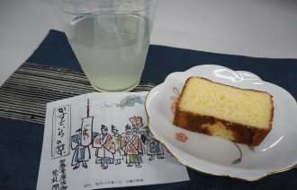 実践女子大学の学祖下田歌子先生の出生地である岐阜県恵那市ゆかりのカステラと特産品の柚子と寒天を使用したジュレです。恵那市で行った食育活動の展示も行われました。