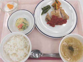 ご飯、グリルチキントマトソースがけ(添え野菜:かぼちゃ、ピーマンの素揚げ)、ポテトサラダ、切干大根入りコンソメスープ、フルーツヨーグルト