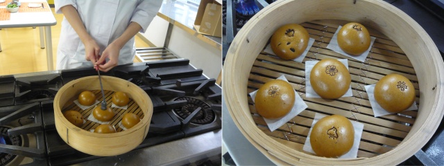 本学では蒸しあがったあと、焼印(千鳥・桜・校章)を押しています。