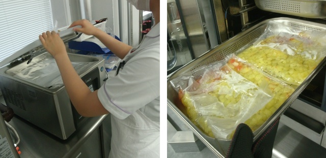 真空調理法を初めて経験した学生は、パックに入った食材と調味料が真空される様子や調味料の浸透具合に驚いている様子でした。