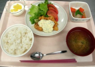 麦ご飯・大根と豆苗の味噌汁・チキン南蛮・里芋の煮物・りんごヨーグルト