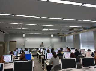 毎回授業のはじめに、PC演習室で、観察する細胞や組織、臓器などについて先生から講義を受けます。