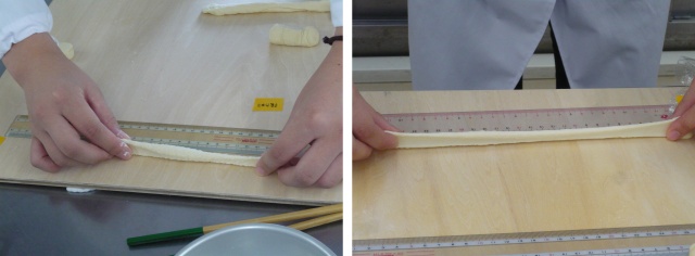 まずは薄力粉と強力粉のグルテンというたんぱく質の含有量の違いを利用し、30回こねた時と30分ねかせた生地で、生地のかたさや両手でひっぱったときの伸びの違いを確認する実験を行いました。