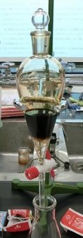 分液ロートに抽出液とジクロロメタンを加え、ゆっくりと混ぜて静置します。
