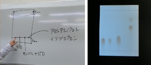 紅茶から抽出したカフェインとアセトアミノフェン・イブプロフェンの混合物をTLC板にスポットします。